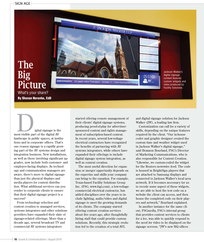 The FSG Technology and A/V solutions team in Dallas recently had the honor of having one of their projects featured in Sound and Communications magazine.