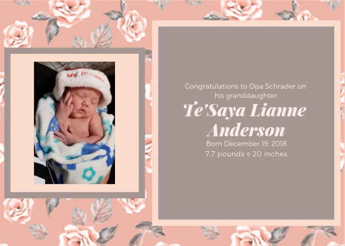 FSG is excited to congratulate Aaron Schrader and wife Crystal on their new granddaughter.