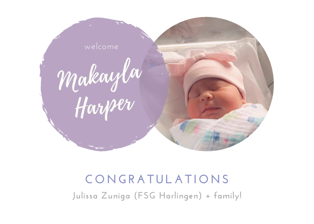 Join us in congratulating Julissa Zuniga, an Administrative Assistant at FSG Harlingen, on the birth of her daughter, Makayla Harper Zuniga!