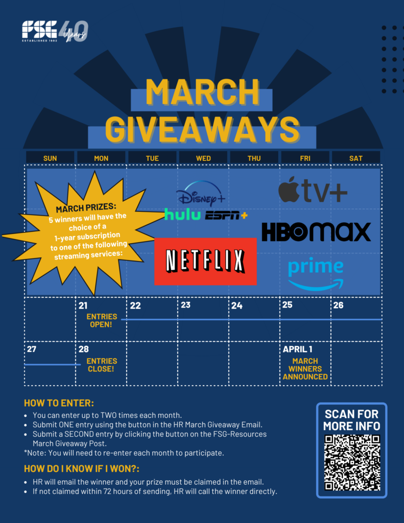 FSG is turning 40 and we want to spread the joy all around the company! FSG’s Corporate Office will be announcing a new giveaway each month, including several different prizes! All you have to do is enter at the bottom of this page! Follow the QR code above or keep reading for giveaway rules!