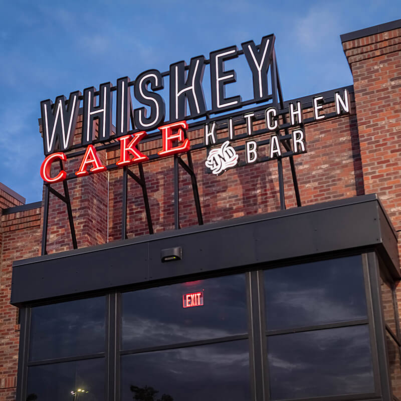 Front Burner Dining Group entrusted FSG Signs with the signage for their new farm-to-table concept restaurant, Whiskey Cake. Having previously worked with FSG for lighting and electrical needs, Front Burner Dining Group knew they would not be disappointed with FSG’s quality of service.