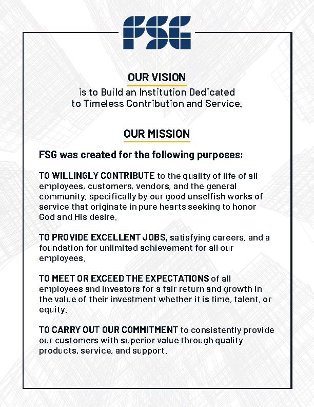 Next to our people, we are grateful for our FSG vision and mission statement. Forty years ago, two guys set out to sell some light bulbs and immediately faced a need for wisdom and faith as a humble start-up. We listened to sermons in our early morning commutes and God gave us both. Looking back now, we see God had plans for us far beyond our plan at the time – survival was our only plan.