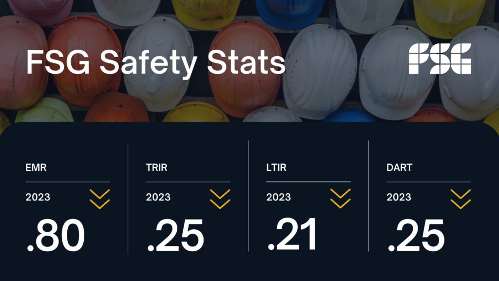 Some of the most commonly used safety ratings include EMR, TRIR, LTIR, and DART. Achieving a low safety rating is a significant accomplishment for any company, especially those of us in the construction industry. Our ratings prove that FSG prioritizes safety, has implemented effective safety management systems to prevent workplace injuries, and that our employees are dedicated to safety.