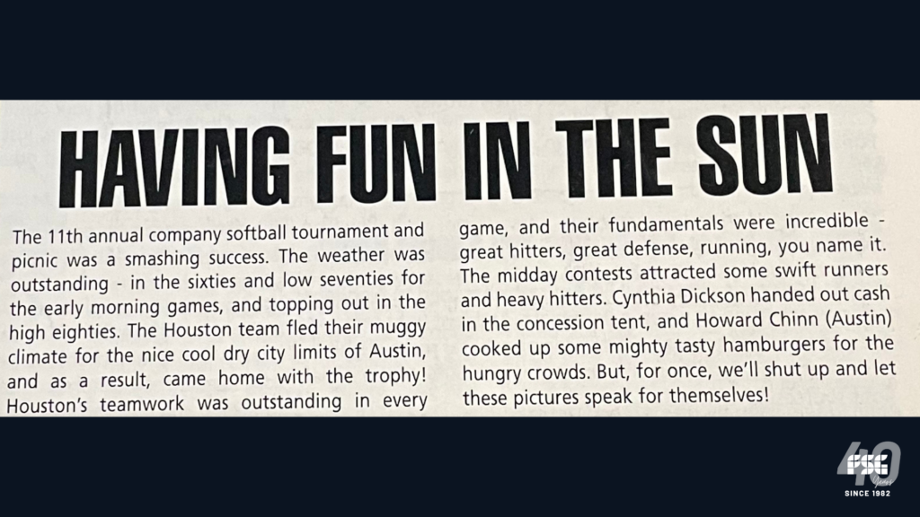 “Houston sweeps the softball tournament! Thanks to some heavy-hitting and fantastic teamwork, the Houston Alliance picked up 3 and 1 to walk off with this year’s trophy. In the last game, down by two runs, they picked up the pace and came from behind to win the game 6-3. Mark Elliott, an all-around winner, also walked off with the longest ball contest and finished second in the fastest man competition. This year is the first year that a team other than Austin or San Antonio has dominated this event. Hats off to Houston!”