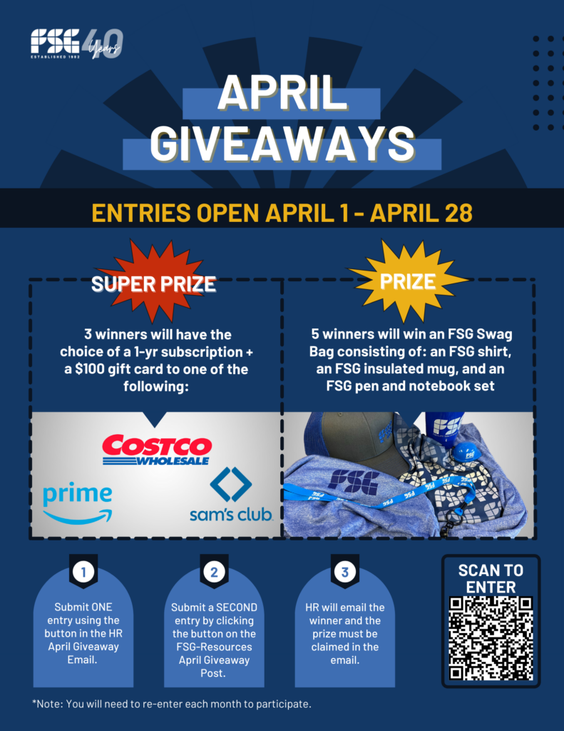 FSG is turning 40 and we want to spread the joy all around the company! FSG’s Corporate Office will be announcing a new giveaway each month, including several different prizes. All you have to do is enter at the bottom of this page!