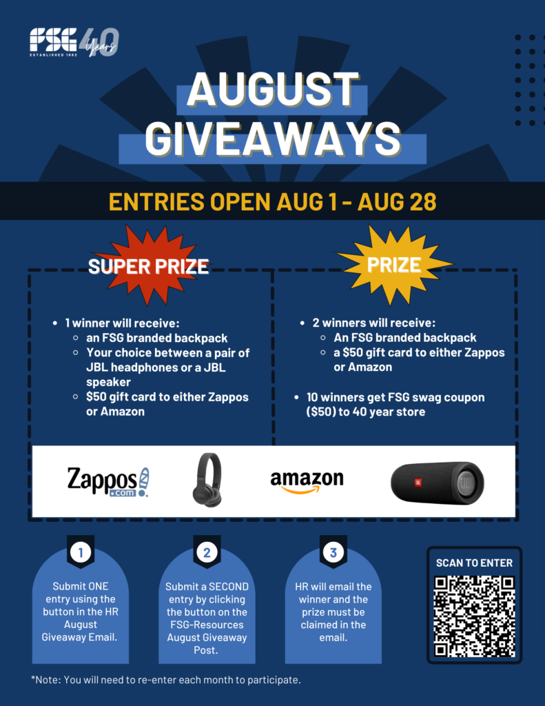 FSG is turning 40 and we want to spread the joy all around the company! FSG’s Corporate Office will be announcing a new giveaway each month, including several different prizes. All you have to do is enter at the bottom of this page!