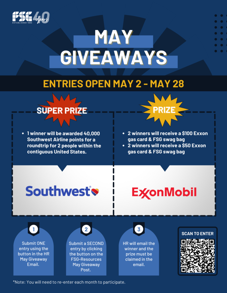 FSG is turning 40 and we want to spread the joy all around the company! FSG’s Corporate Office will be announcing a new giveaway each month, including several different prizes. All you have to do is enter at the bottom of this page!