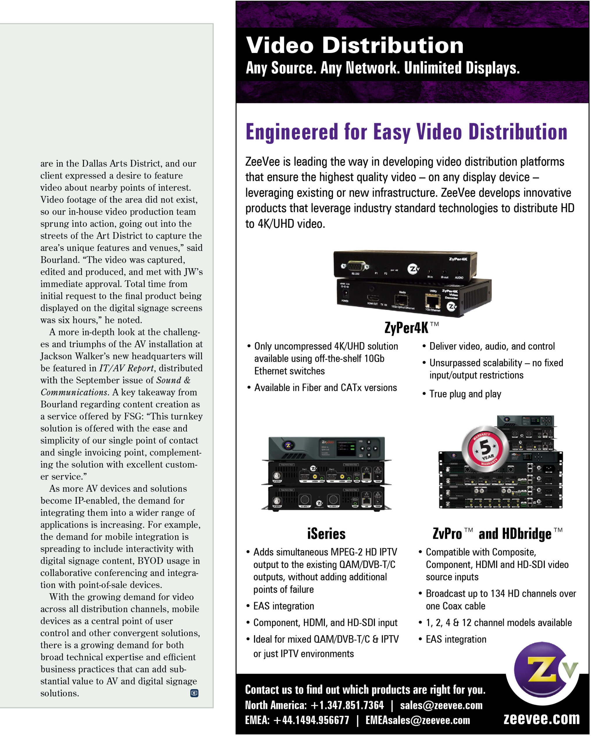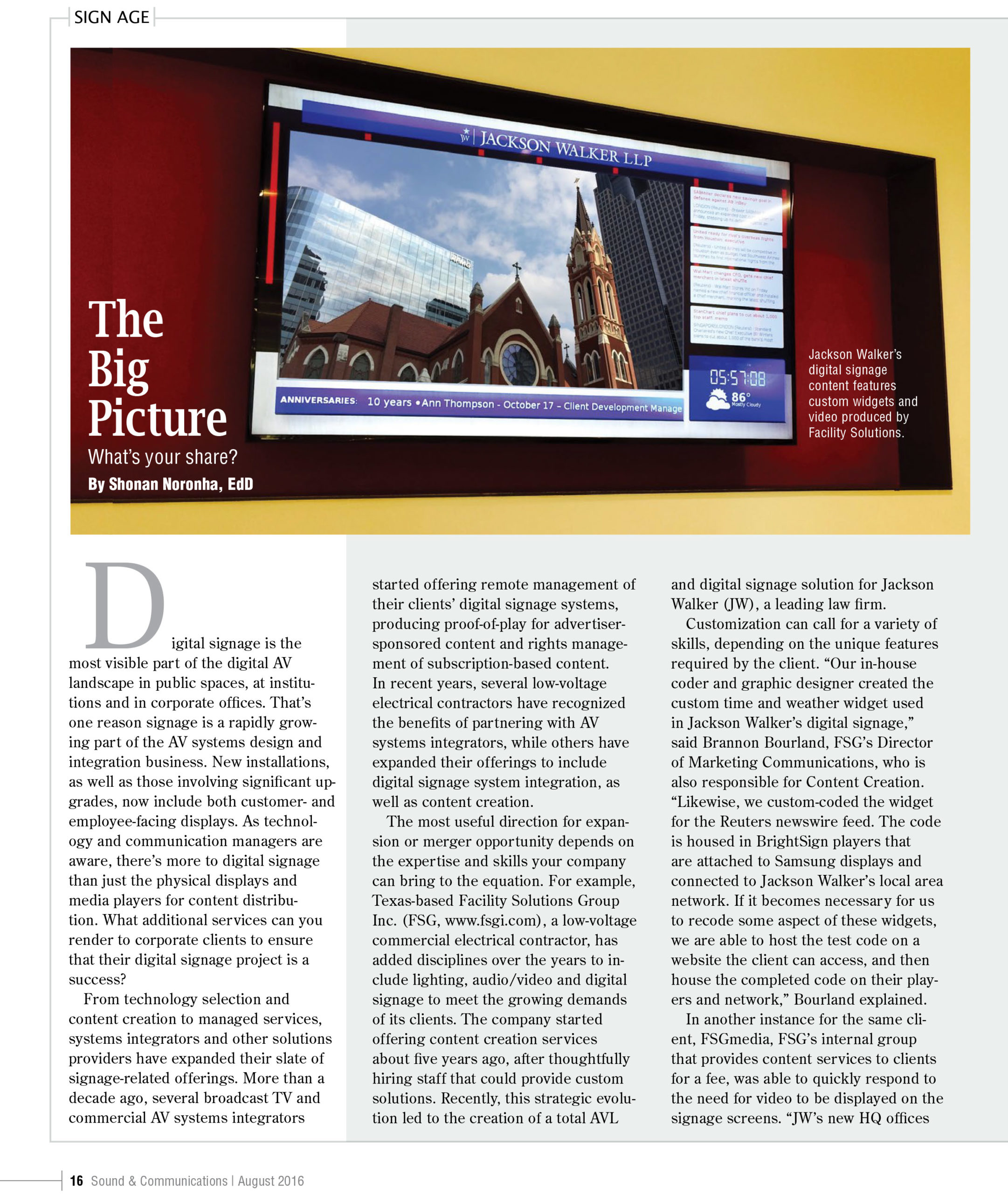 It is the complete audio video design build solution that grabbed the attention of Sound and Communications magazine in this month’s issue. Specifically Shonan Noronha takes a closer look at the digital signage information solution provided as a part of the total A/V package for Jackson Walker. Shonan explores the system as well as the landscape of the digital signage market and how companies can increase their market share in this rapidly growing segment.