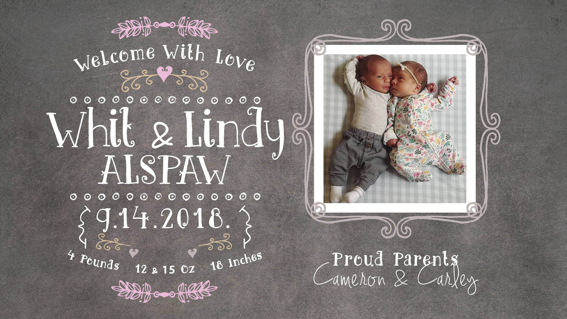 Cameron and Carley welcomed Whit and Lindy on September 14th 2018. Whit weighed in at 4lbs 12oz and Lindy beat her brother at 4lbs 15oz. Both were 18 inches long.