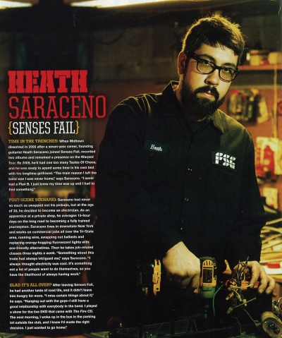 Heath was featured in a special “Life after Punk” article in Alternative Press Magazine in March of 2011, resplendent in his full FSG uniform and tools. He currently attends the NJ certfied Apprentice Electrician program, attending class two nights a week with fellow FSG apprentices Ismael Reynoso and Mike Corless. Aside from a good work ethic, Heath is most identified with his positive attitude and can-do approach to tackling anything thrown at him.