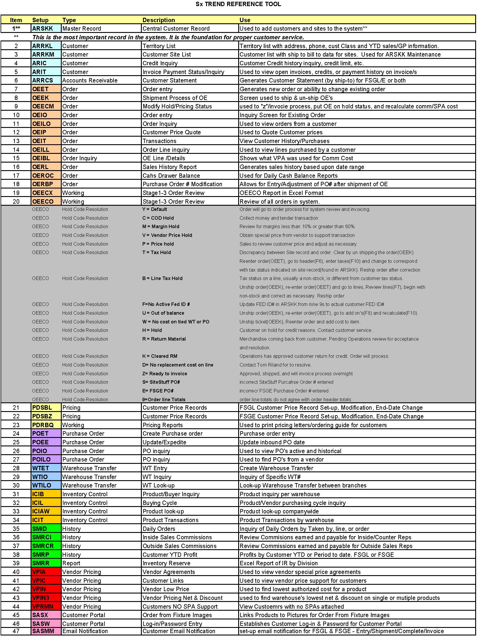 This cheat sheet can be found in the folder: \\fsg9\public\Corp\Training\ the file name is: sx TREND ANACRONYM CHEATSHEET.xls. Click HERE to view this cheat sheet.