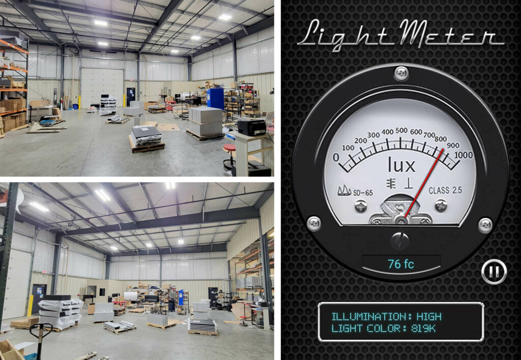 The results were outstanding! The photometric analysis revealed that we exceeded expectations by delivering an impressive 76+ foot candles, as verified by the light meter readings. The team at the machine shop was delighted with the outcome!
