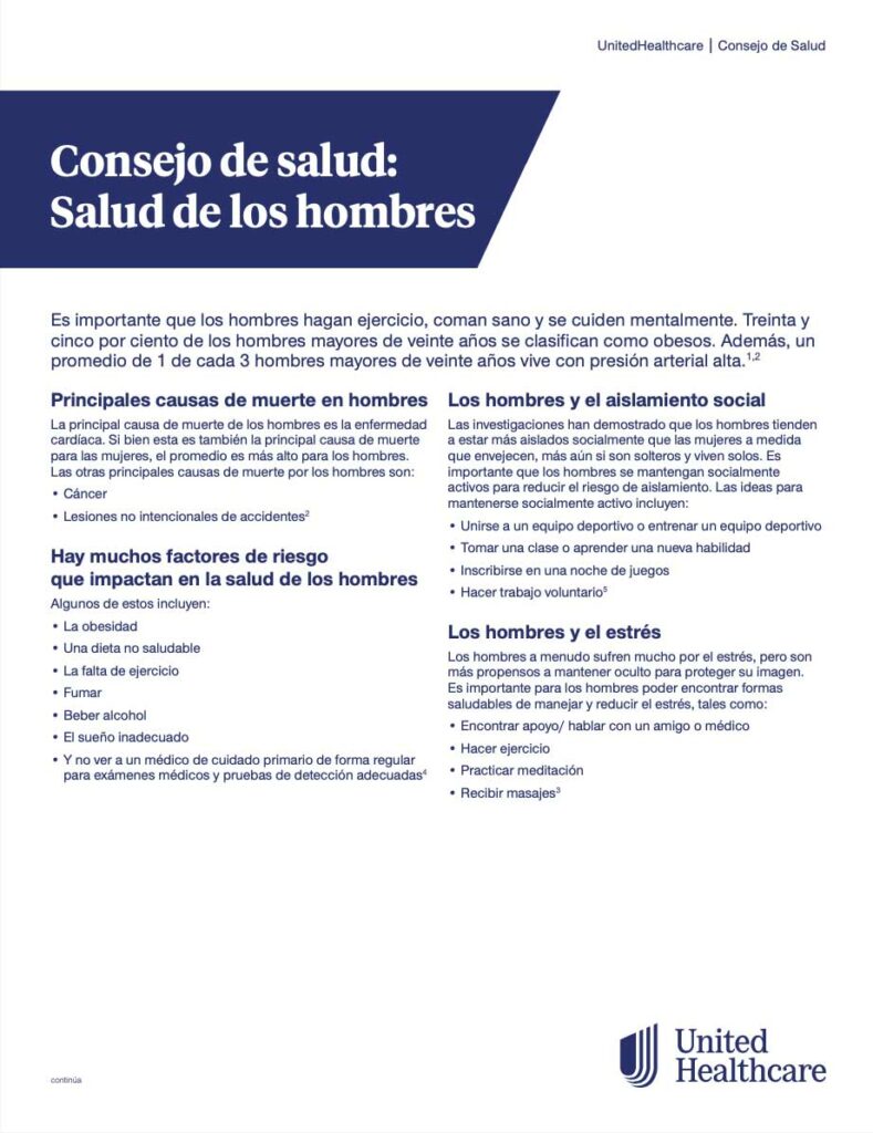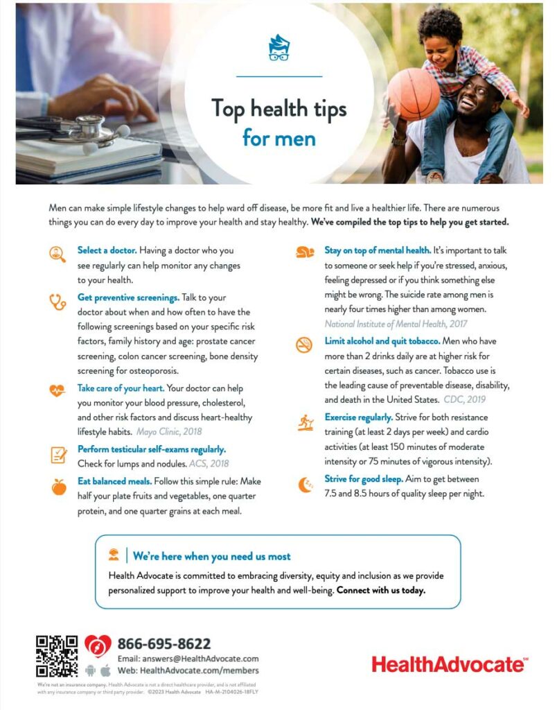 United Healthcare and Health Advocate have put together quick-reference PDFs to provide you with information on men’s health issues, recommended screenings, and actions you can take to improve your overall health. We encourage you to take some time and read through them.