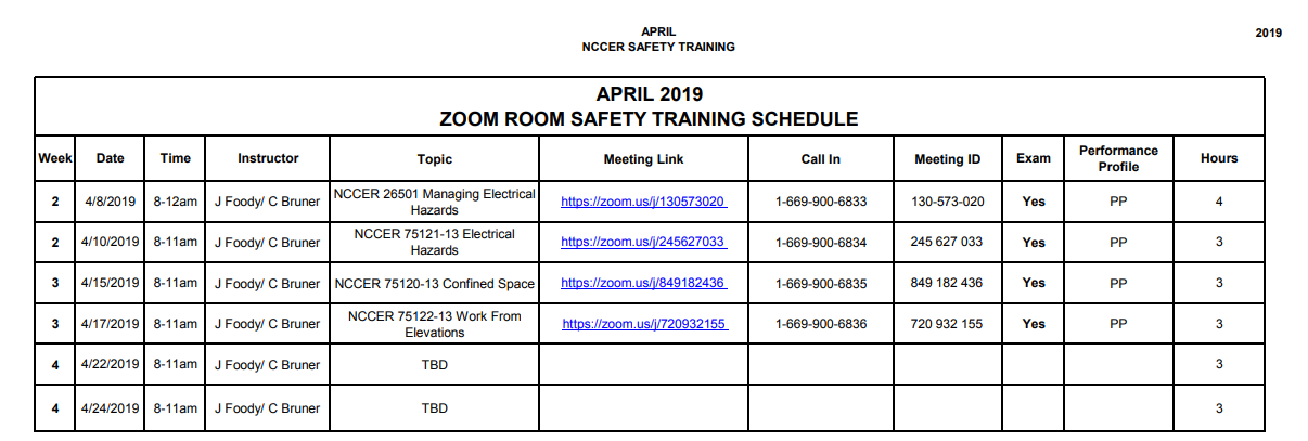 Zoom’s technology will allow FSG to host widespread training sessions. As of now, Cory Bruner and John Foody have scheduled NCCER training classes for the month of April. The Zoom Room makes it possible for apprentices to attend classes while being in a completely different location. The Human Resources team at Corporate has scheduled “HR Huddles” every Friday at 2pm CST. In these training sessions, HR will cover best practices for all things HR. Anyone is invited to attend the HR Huddles to learn and ask questions about everyday HR tasks. Below you will find the April schedules for Safety Training and the HR Huddles.